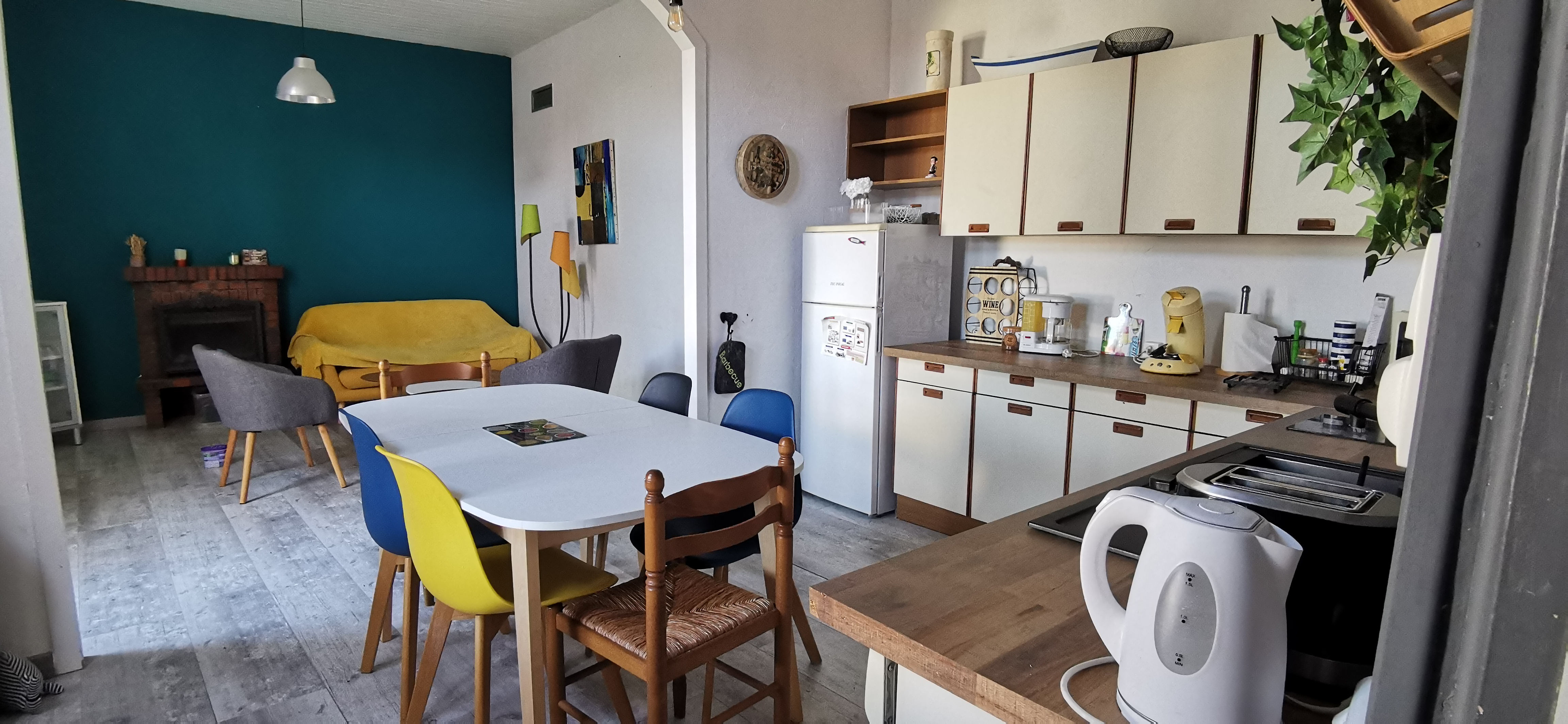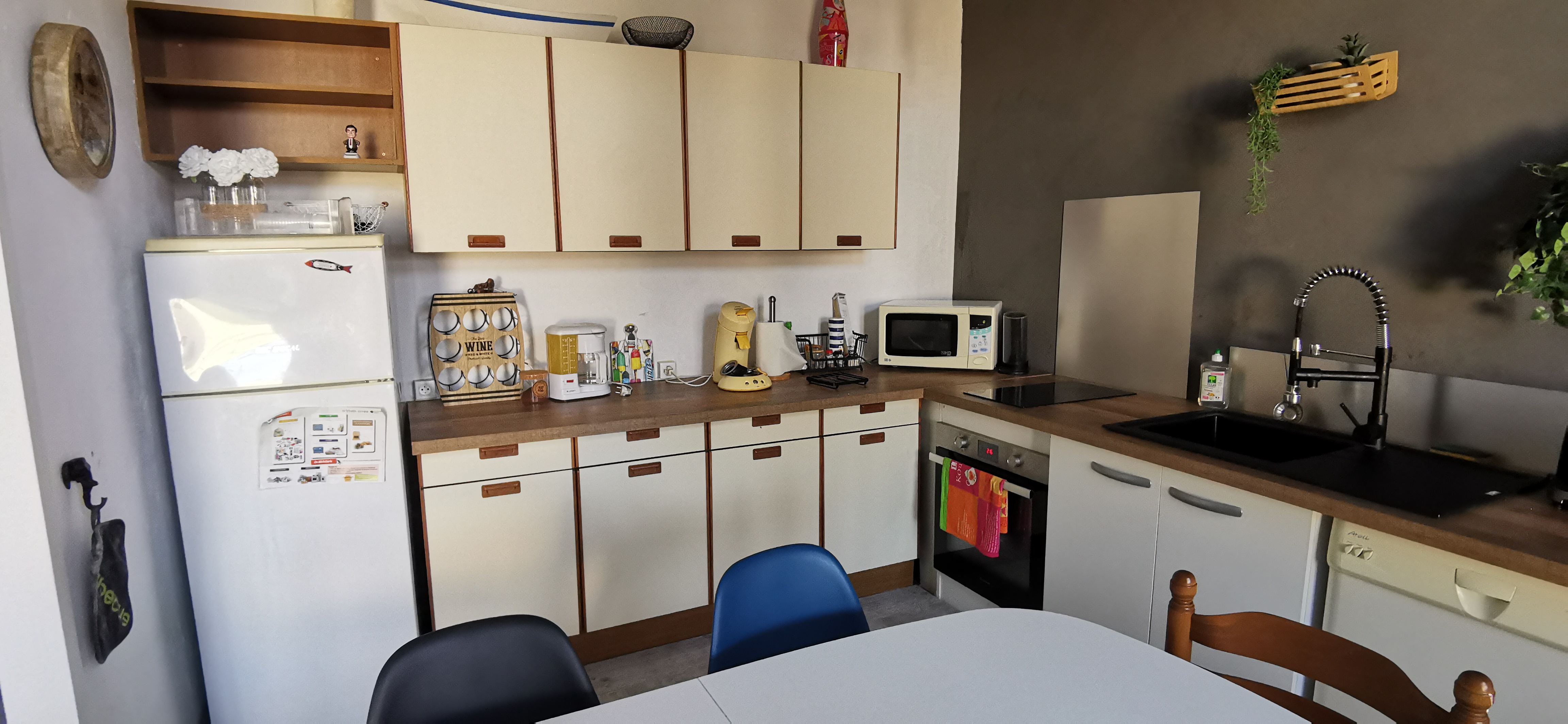 Cuisine équipée (réfrigérateur/congélateur, évier, four, micro-ondes, plaque vitrocéramique) ouverte sur la salle à manger, coin télévision avec canapé,