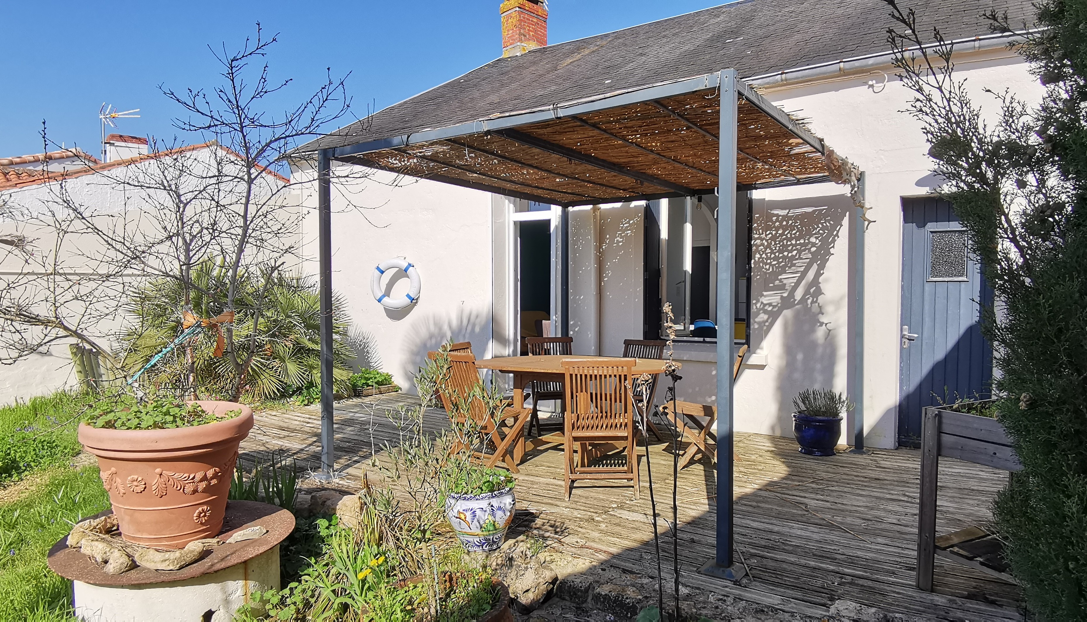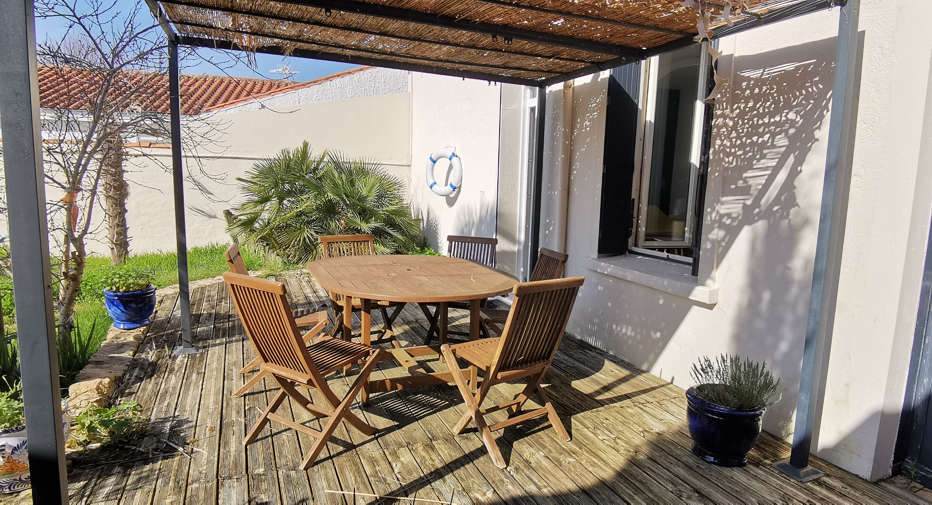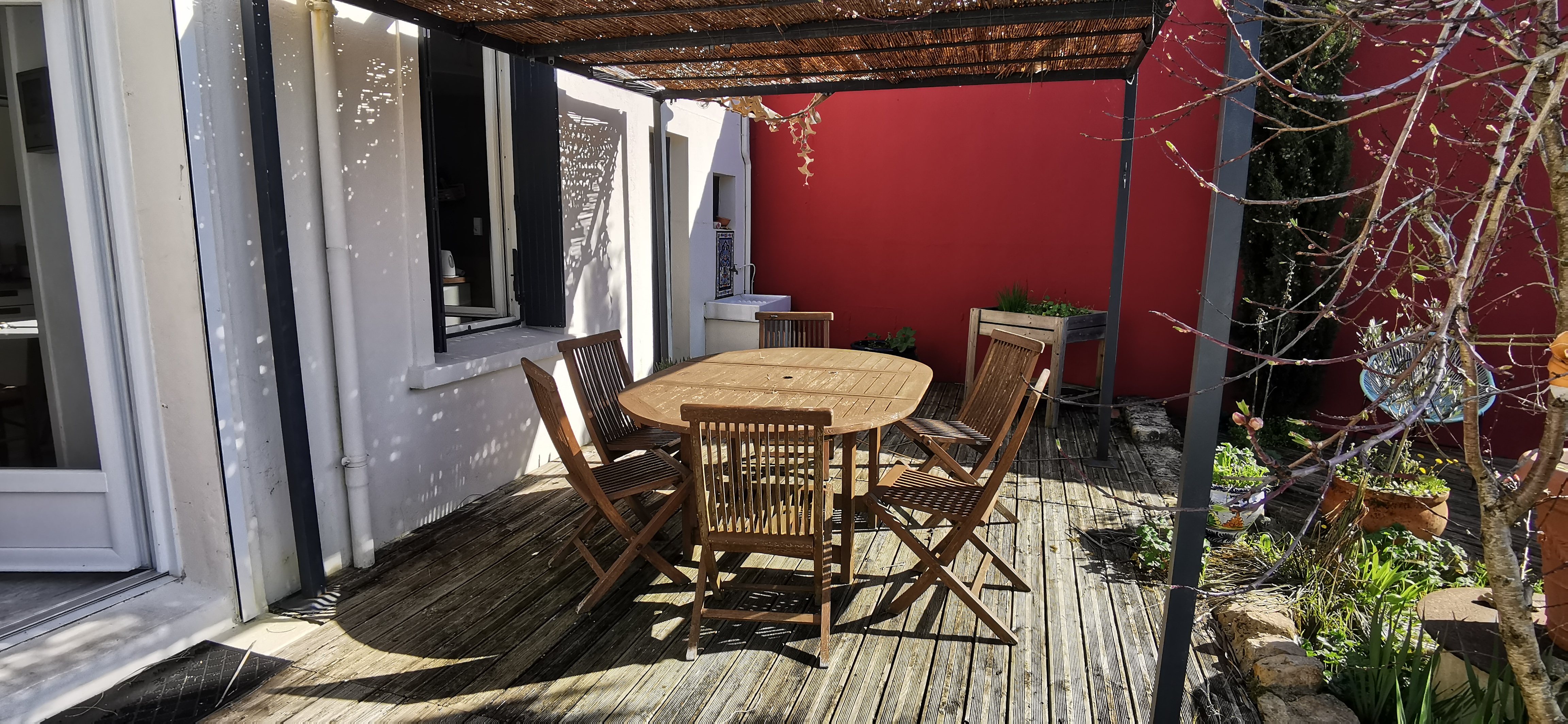 Terrasse exposée sud/ouest, salon de jardin, parasol, pergola,
