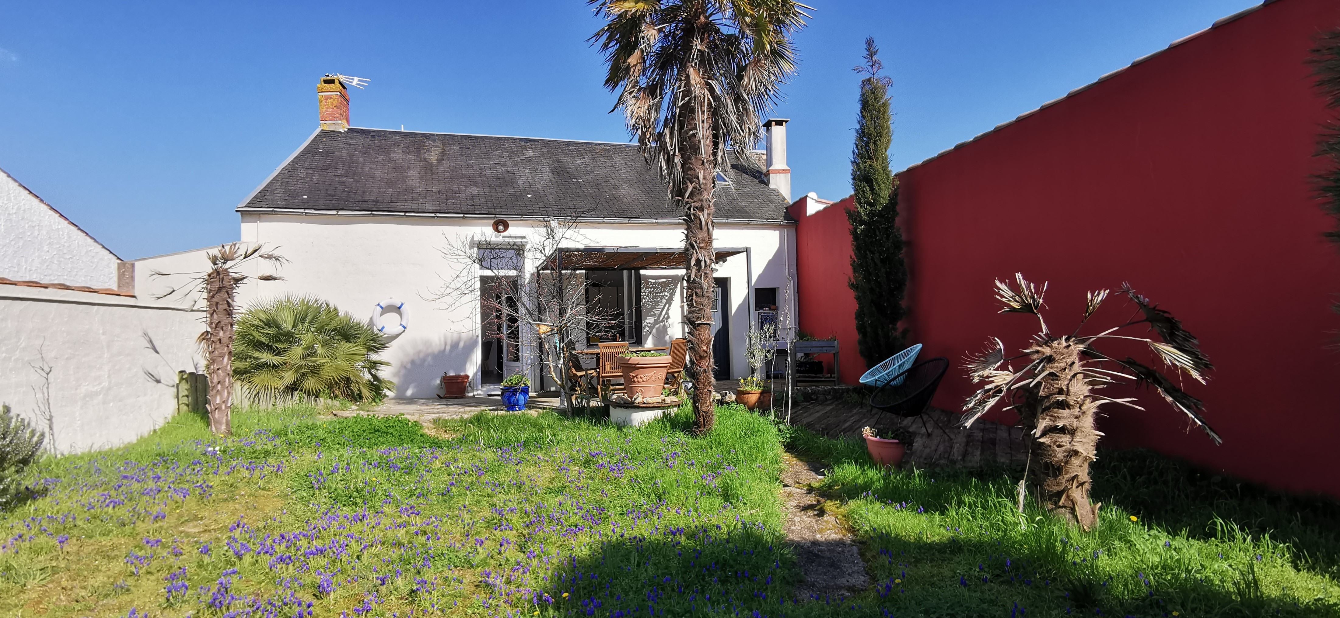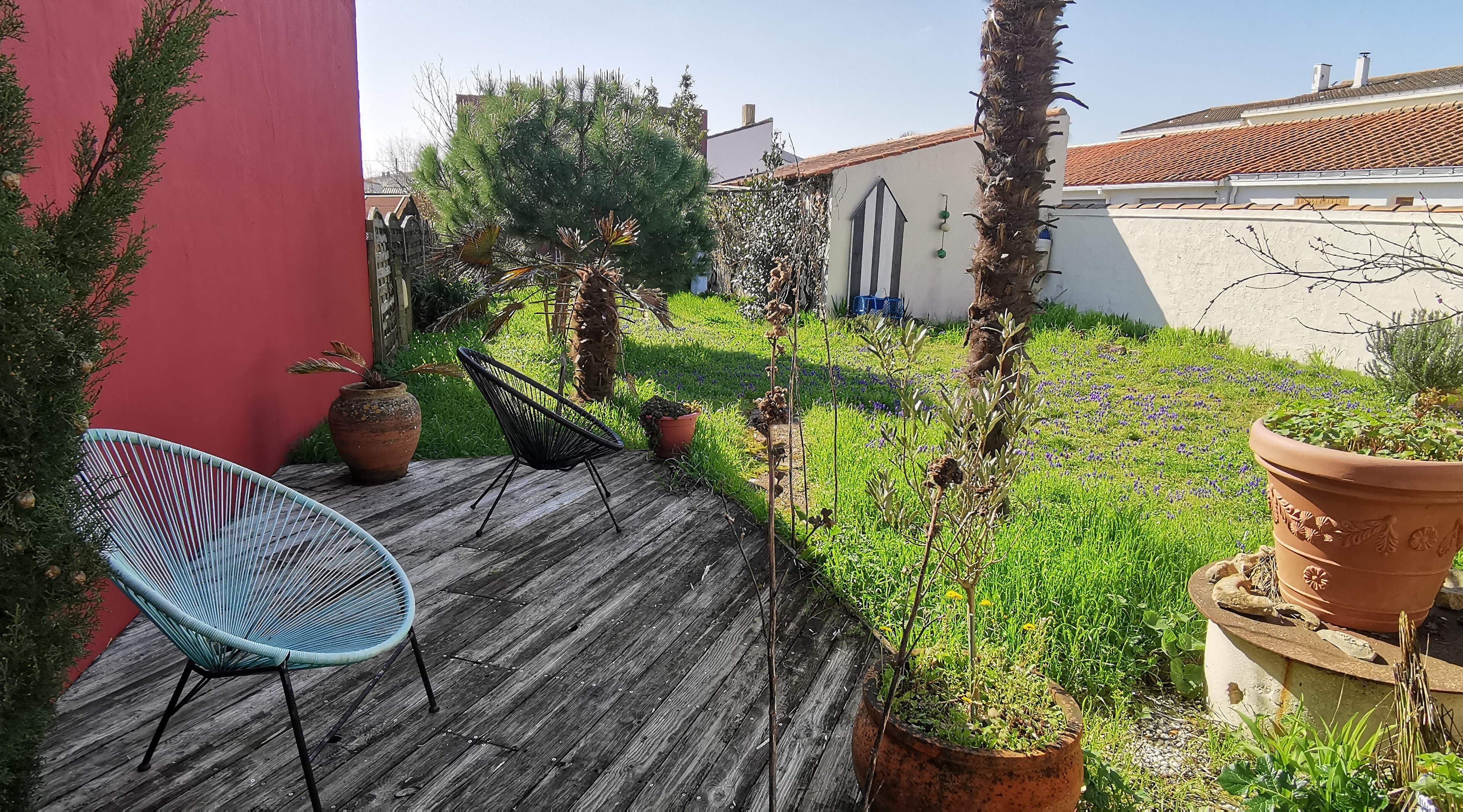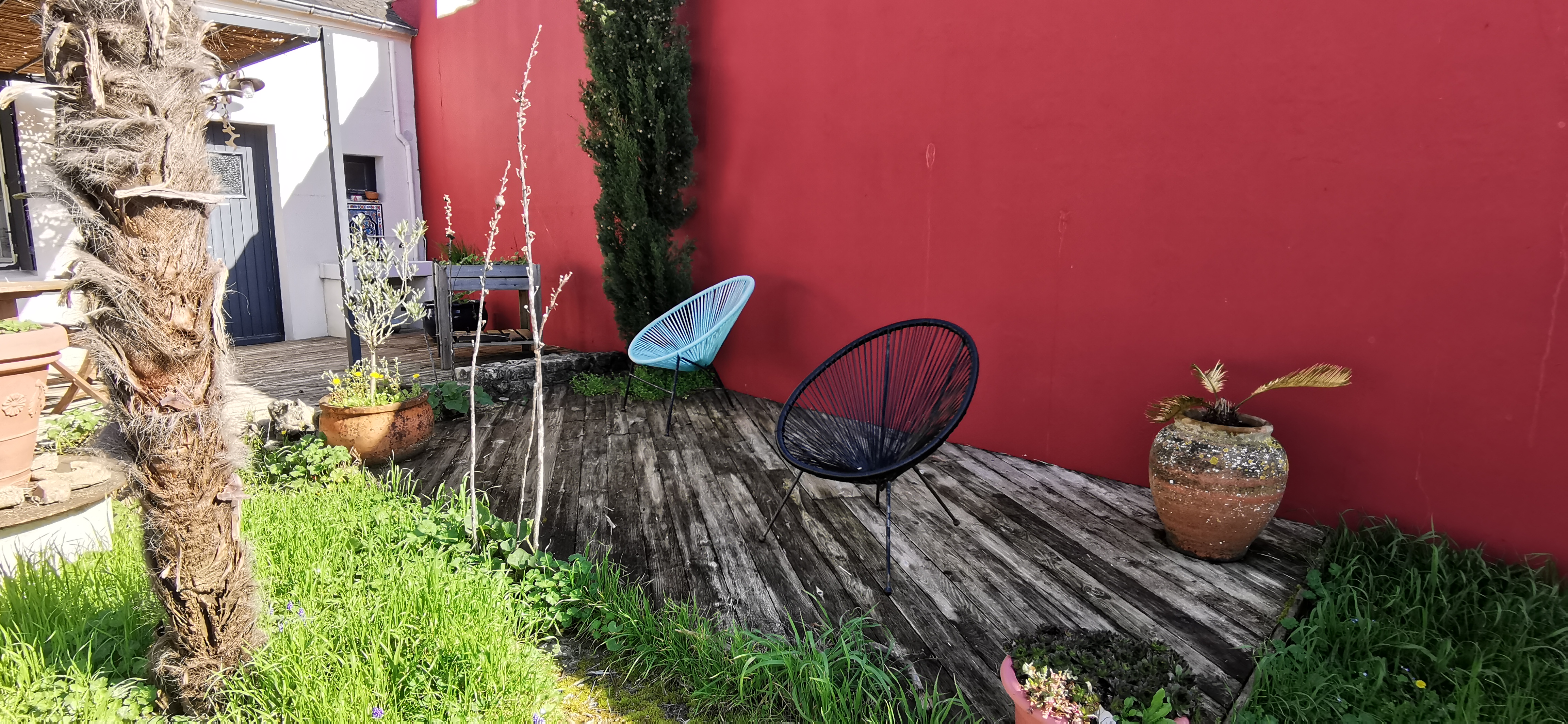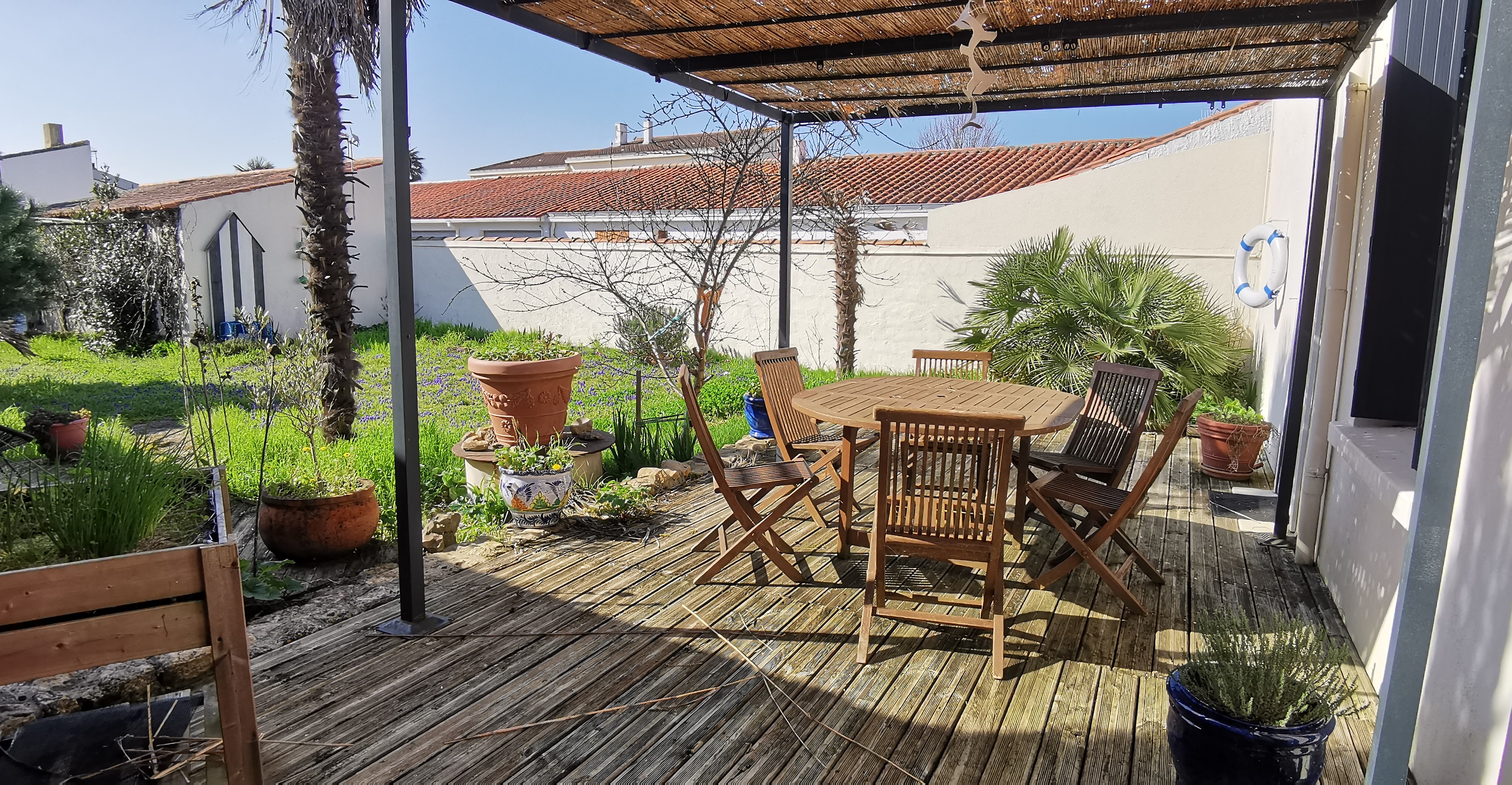 Terrasse exposée sud/ouest, salon de jardin, parasol, pergola,